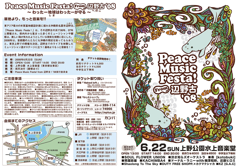 ■雨天決行。開場にはドーム式の屋根がありますが、濡れる場所もあるので、雨具(レインコート)などは各自で用意して下さい。 ■天災や不慮の事故などによる中止や、出演者のキャンセル・変更に対してのチケット料金の払い戻しはできません。 ■安全確保の為、入場を制限する場合があります。 ■入場時にチケットをリストバンドと引き換えます。これは再入場の際に必要になります。紛失や破損による再発行はできません。 ■会場内外での事故・盗難・紛失等の責任は一切負いません。 ■危険物や法律で禁止されている物の持込みは禁止とさせていただきます。 ■演奏の録音およびビデオ撮影は固くお断りいたします。 ■ペット同伴不可(介助犬は除く)。 ■ロッカー・クローク等の荷物の保管場所はありません。 ■会場内や付近での無許可の販売/演奏行為などは禁止いたします。 ■飲食物の持ち込みは可能ですが、ゴミは必ず各自でお持ち帰りください。また、会場付近のゴミ箱、収集所、コンビニなどへのごみの置き去りは絶対に止めてください。 ■喫煙は指定の喫煙場所をご利用下さい。 ■駐車場はありません。なるべく公共交通機関をご利用ください。 ■イベント終了後は速やかにお帰りいただきますよう、ご協力ください。 ■場内での携帯電話の使用は他のお客様の迷惑にならぬよう細心の注意をお願いします。